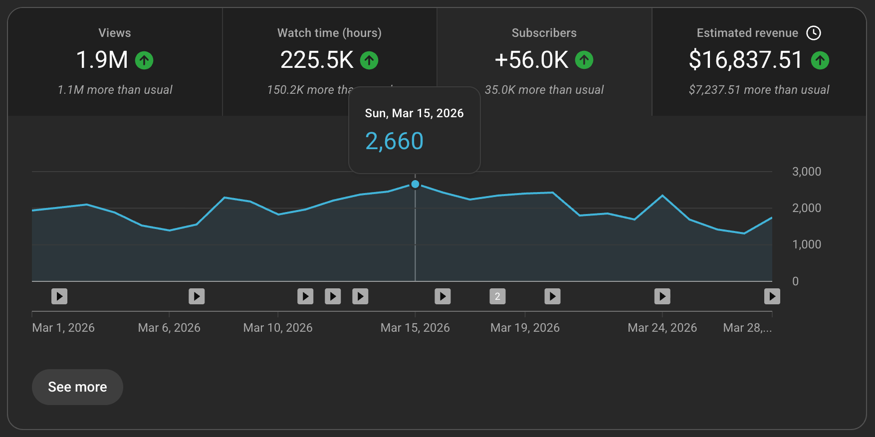 From what I can tell, a disproportionate amount of my subscriber growth comes from a handful of videos. It is almost never a steady, even drip across everything I publish—it is a few massive spikes that carry the rest.