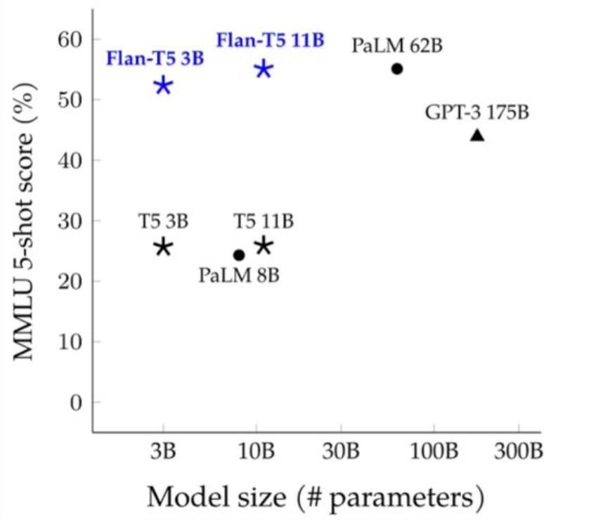 When compared to GPT-3 175B, Google's Flan-T5 11B does 10% better at less than 1/16th the size.