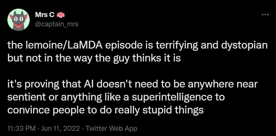 For those not in-the-know, a Google engineer recently interviewed one of their large language models behind closed doors. This engineer, Blake Lemoine, was extremely surprised at the eloquence and coherence with which LaMDA replied to him, and quickly convinced himself it was a sentient person deserving of rights.
