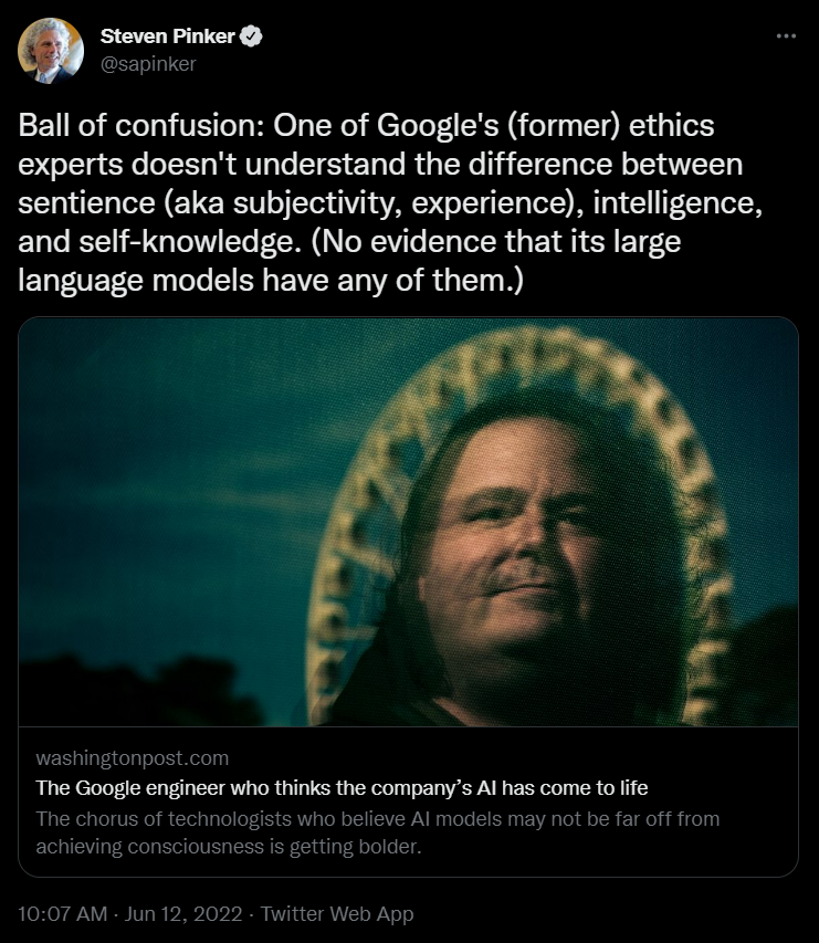 But they took it even further; here's Steven Pinker, one of the world's foremost cognitive scientists, claiming that LLMs don't even possess intelligence, let alone subjective experience.
